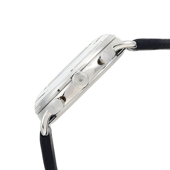 Stainless steel case with a black leather strap. Fixed stainless steel bezel. Blue dial with luminous silver-tone lance-style shape hands and index hour markers. Minute markers. Tachymeter markers around the outer rim. Dial Type: Analog. Luminescent hands. Date display at the 6 o'clock position. Chronograph - two sub-dials displaying: 60 second and 24 hour. Quartz movement. Scratch resistant mineral crystal. Pull / push crown. Solid case back. Round case shape. Case size: 43 mm. Case thickness: 12 mm. Band width: 22 mm. Tang clasp. Water resistant at 50 meters / 165 feet. Functions: chronograph, tachymeter, date, hour, minute, second, 24 hour. Pilot watch style. Watch label: Japan Movt. Emporio Armani Aviator Chronograph Quartz Blue Dial Men's Watch AR11105.