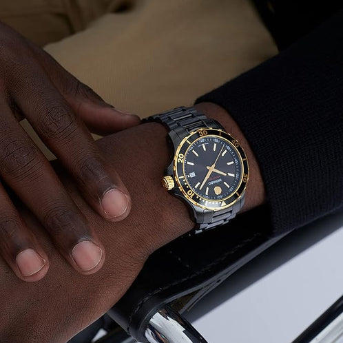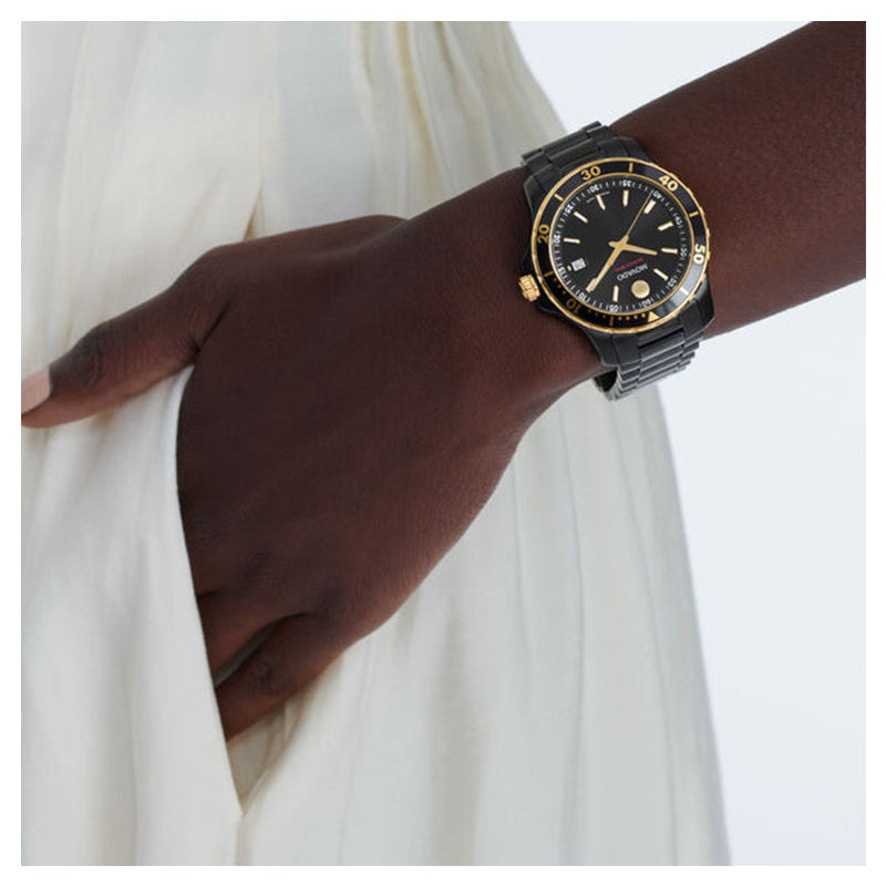 Boldness and sophistication merge seamlessly with the Movado Series 800 Gold & Black PVD Men's Watch, perfect for your collection. The watch pairs a striking gold-toned stainless steel case with a black PVD-finished bezel. This visual appeal is not just for you to show off; it signifies a watch built strong enough to endure. Perfect for your dynamic lifestyle, it complements both business attire and casual outfits with ease. The gold and black theme continues throughout, creating a design that captivates and is sure to hold other’s attention.
