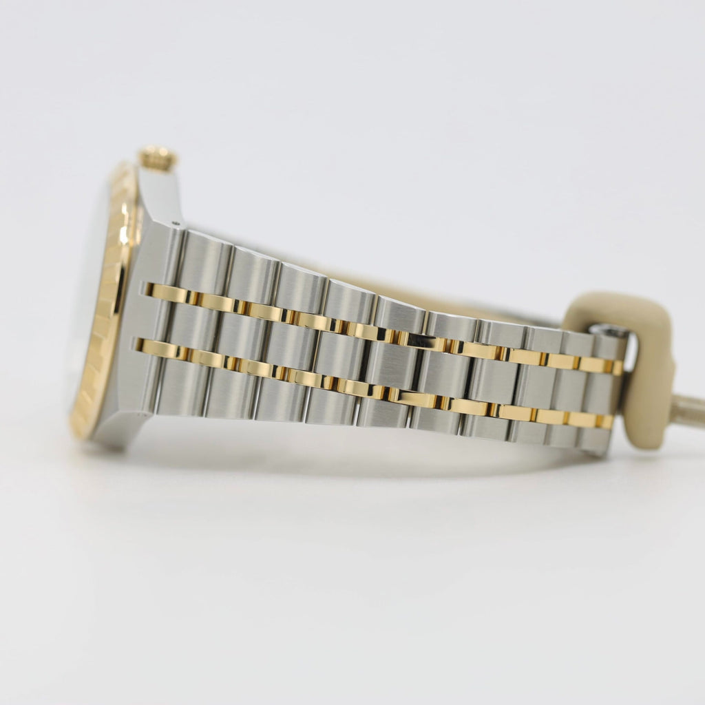 This Tudor Royal 41mm offers effortless versatility and sport-chic style, showcasing a sunray-finished silver dial with applied Roman numerals, a day display at 12 o’clock and a subtle date window at 3 o’clock. It is housed in a stainless steel case with a screw-down crown adorned with the Tudor logo and a notched yellow gold bezel featuring alternating cut grooves, giving the watch a distinctive shine and a touch of sophistication. Fitted on an integrated two-tone bracelet with a folding clasp to provide extra security and blend seamlessly with the case. In addition to its 100m water resistance, this model is powered by the T603 Calibre, which offers up to 38 hours of power reserve.